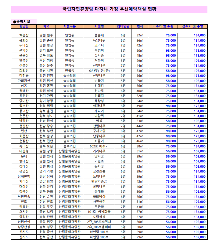 국립 자연 휴양림 중에서 다자녀 가정 우선 예약 가능한 객실 현황을 알려드립니다.