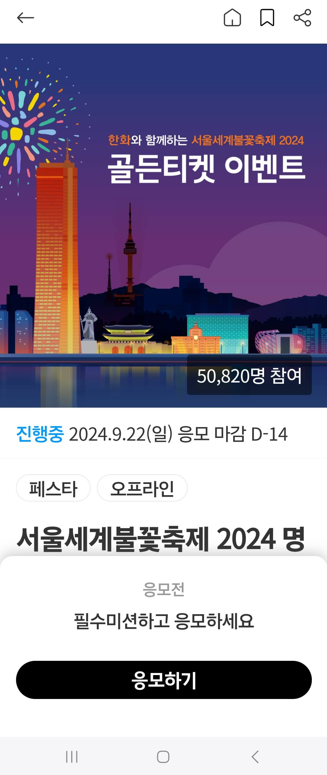 - 경품: 서울세계불꽃축제 2024 골든티켓 400명 (1인 2매 지급)