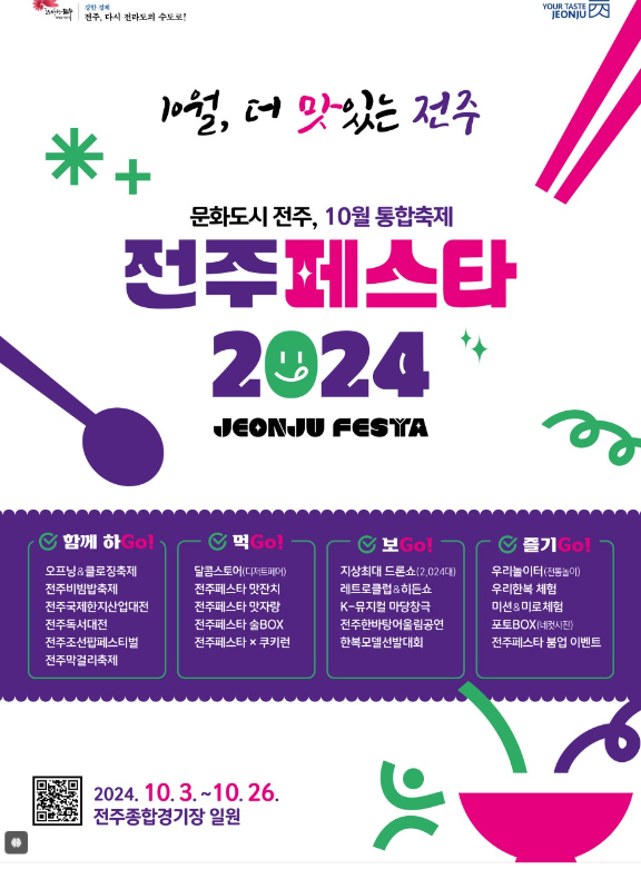 | 2024 전주페스타 축제 일정 확인 (행사 캘린더) (0) | 2024.10.08 |