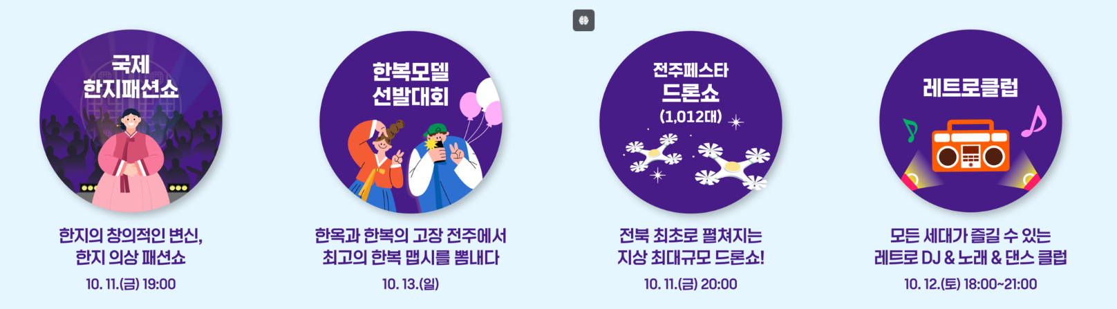 | 10. 11 (금) 20:00 | 전주페스타 드론쇼 | 전북 최초로 펼쳐지는 지상 최대규모 드론쇼 |