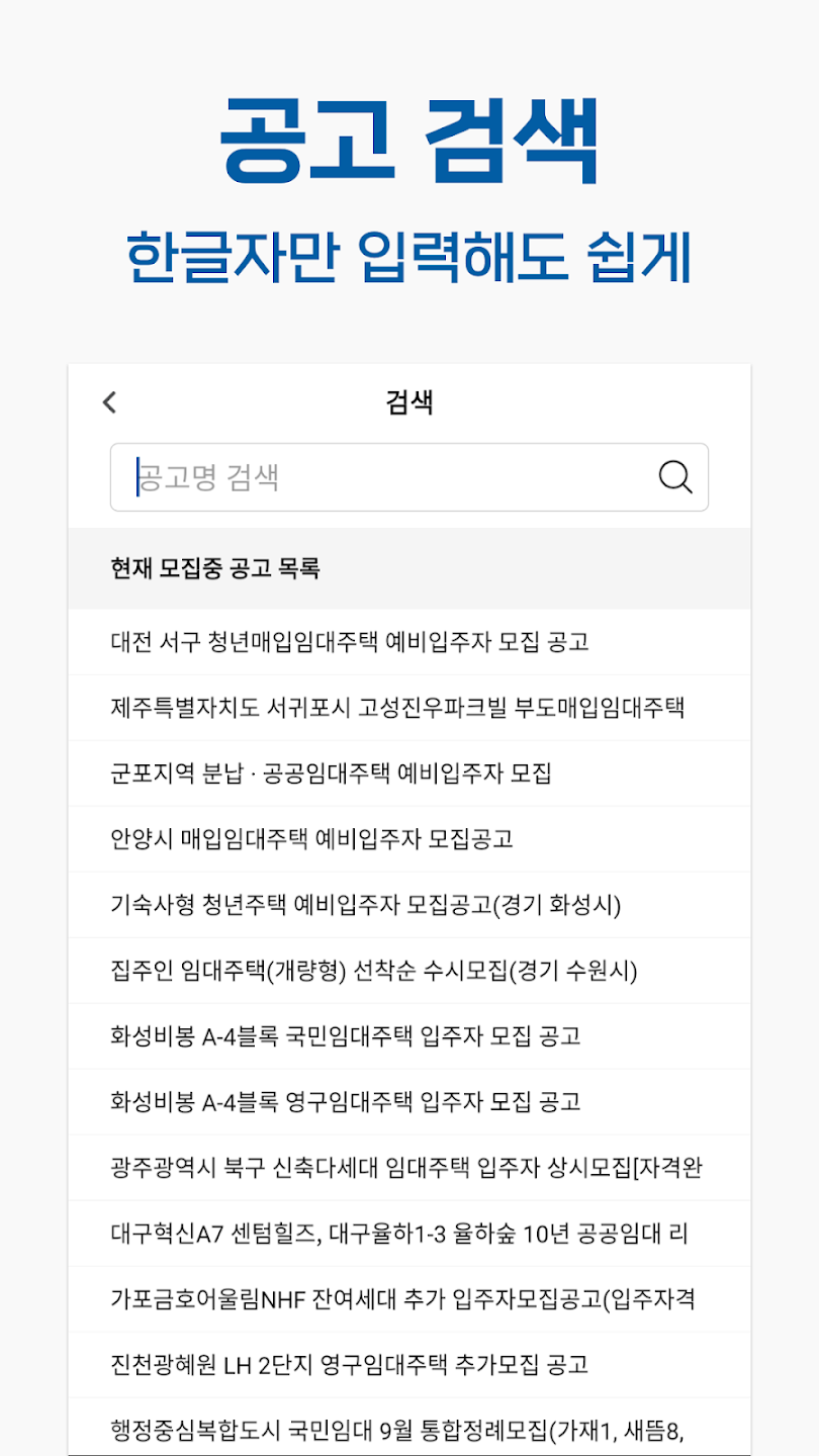- 공고 검색 기능: 검색 기능을 통해 특정 키워드로 임대 공고를 빠르게 찾을 수 있으며, 원하는 조건에 맞는 주택을 신속하게 확인할 수 있습니다.